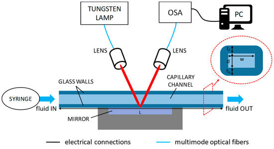 Rectangular glass micro-capillaries in borosilicate glass (Vitrotubes™, Part#2540, Vitrocom, NJ, USA) are inserted in the optical setup used to test liquid samples, as shown in Figure 1. They have nominal wall thicknesses tf = tb = 280 μm, as well as nominal channel depth d = 400 μm, width w = 4 mm and length L = 5 mm. The capillary is laid horizontally on its flat side on a 3.2-mm-thick Al-coated mirror (ME1S-G01 Thorlabs, NJ, USA) and its extremities are inserted in heat-shrink tubes with Luer connections to fill and drain the channel with a syringe. The volume of sample required in the measurement area is of the order of 18 µL. Light from a tungsten lamp is coupled with a multimode fiber (Thorlabs, NJ, USA) and shone on the devices under investigation using an FC/PC lens (F230FC-C, Thorlabs, NJ, USA) located at an angle of approximately 14° with respect to the normal angle of the flat capillary surface. After bouncing once on the mirror and crossing the channel containing the sample twice, the output light is collected by another lens identical to the input one. Light is finally directed towards an optical spectrum analyzer (OSA Agilent 86142B, CA, USA) connected to a computer for data acquisition. The acquired spectral data are processed in a MATLAB® environment.