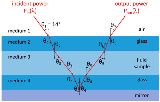 where ni and nj are the RIs of the origin and destination medium, respectively, and θi and θj are the incidence and transmission angle, respectively. When the light reaches the mirror, it undergoes a specular reflection with a power coefficient Rmirror ≈ 0.99. The attenuation due to the sample absorption is calculated by applying the Beer–Lambert law: