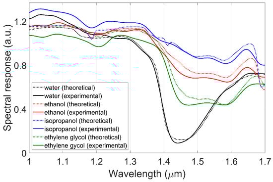 Comparison between theoretical (dotted traces) and experimental (solid traces) spectral responses for water, ethanol, isopropanol and ethylene glycol.