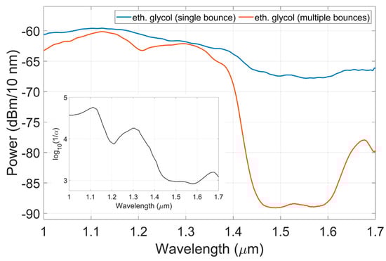 Comparison between the experimental power spectra obtained by flowing ethylene glycol in a single-bounce configuration capillary (blue trace) and in a capillary with longer light path across the channel (orange trace). Inset: base-10 logarithm of 1/α, where α is the absorption coefficient of the ethylene glycol (expressed in cm-1) as a function of the wavelength.