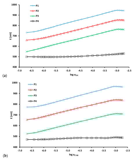 Direct potentiometric titration curves for (a) CPC (c = 4 × 10−3 M) and (b) CTAB; with DS (c = 4 × 10−3 M) obtained by the use of DMI-TPB sensor and for different plasticizers, from left to right: 2-nitrophenyl octyl ether (P1), bis(2-ethylhexyl) phthalate (P2), bis (2-ethylhexyl) sebacate (P3) and dibutyl sebacate (P4).