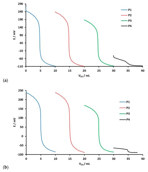 The titration curves of CPC (c = 4 × 10−3 M) with DS (c = 4 × 10−3 M), using DMI-TPB sensors containing four different plasticizers, exhibited well-defined and sharp inflexion points (Figure 2a). Only the sensor membrane containing the P4 plasticizer obtained small signal change, but still with potential jump at expected equivalence point volume values. This was expected due to low slope exhibited for P4 formulation shown in Figure 1a. The highest value of potential change at the end-point was demonstrated by the sensor containing P1 plasticizer.