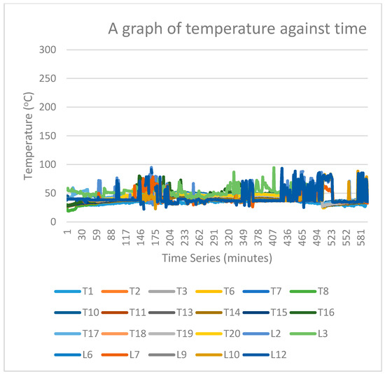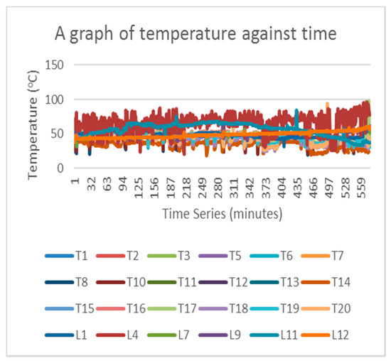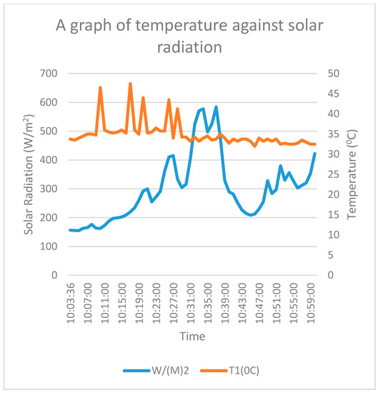 Figure 7 is the graph of temperatures (temperatures at the front or top of the PV module, the temperatures at the back of the PV module, the temperatures of air flow in the first channel of the air heater, the temperatures of the second flat plate—the black painted aluminum sheet, the temperatures of the air flow in the second channel and finally, the temperatures of the bottom plate of the air heater (black painted)) against time interval [9]. In this work, the time interval is regarded as time series hence, the temperature logger takes reading at every 1 min. From the graph in Figure 7 and Figure 9, it can be seen that as the temperatures fluctuated the solar radiation fluctuated as well. In Figure 8, the temperature point T1 was one of the temperatures at the base of the PV module (the first flat plate solar collector of the hybrid PV/T flat plate solar air heater). This one temperature point was compared with the solar radiation. The solar radiation was measured with a standard solar radiation logger known as TES 1333R Data logging Solar Power Meter. Of course if you look at the comparison between the temperature point and the solar radiation in Figure 8, you will find out that they compared well, though there might be some errors due to human input or the instrument (probably settings on the meter etc.). In Figure 8, the positive and negative turnings of the temperature point almost compared well with the insolation. The results in Figure 10 are alike also showing that the locally made temperature data logger could also compare well with the standard logger such as TES 1333R Data logging Solar Power Meter. In my next edition of publication, it is realized that the temperature ambient point compared well with the standard temperature–humidity data logger. From this work, it can be known that the trend of temperature flow pattern is the same as the solar radiation trend. However, some sharp decrease in temperature was sometimes noted as a result of shading in weather conditions [8,9,10,11,12]. The trend of temperature flow in °C depends on the trend of solar radiation in W/m2. From the above, it can be determined that the operating module temperatures and other temperature points in the system are considerably dependent on solar radiation [10].