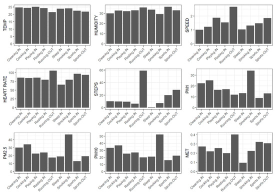 Resting is also somewhat characterized with longer consecutive time intervals without interruptions. It also has the most misclassifications and highest false positive (FP) rate, which is due to the fact that resting is the second most frequent activity chosen by participants (after sleeping) in the whole study and in turn should overlap with most activities very frequently (the “default” activity being resting). It is also vaguely defined and open to interpretation, which can prompt participants to include a whole swath of activities under this term, for example, reading a book, playing board or computer games, watching television, chatting with friends, taking a leisurely walk, napping, having a dinner party, et cetera. All of these activities can differ in many aspects, such as heart rate, movement, speed or PM concentrations, which would make accurate predictions more difficult.