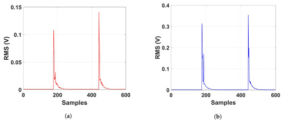 RMS values of the partial discharge signal for: (a) PZT; and (b) MFC.