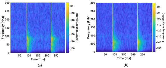 To guarantee the observation of recurring PDs and analyze the frequency response band, STFT was extracted. Figure 4a,b presents the STFT for the PZT and MFC sensors, respectively.