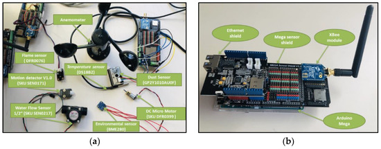 This section gives details on the different system components and sensors, and their implementation in the experimental setup. For the goal of monitoring fault detection, minimum time delay, safety and security, several low-cost sensors have been employed. All sensors are based on Arduino (or compatible boards) and the most relevant are shown in Figure 4a. Digi’s XBee-PRO operating at 2.4 GHz band have been employed as RF modules. The Arduino sensor shield allows the Arduino Mega boards employed to be integrated easily with sensors and XBee modules. The data collected by the network coordinator (see Figure 4b) are transferred to the internet and, therefore to the cloud, through an ethernet shield.