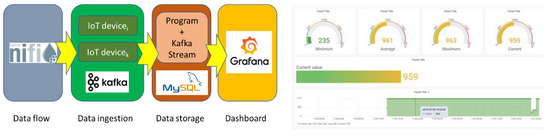 Monitoring is performed with the aid of a cloud-based system. The usage of a cloud-based solution allows us to dispense with large and costly computing infrastructure, while offering an adequate scalability and adaptation to the specific computational needs. A specific cloud infrastructure has been developed, located at the campus of the Public University of Navarre. This infrastructure includes six Teknoslim computers from TTL Computer (Sevilla, Spain), equipped with Intel i5-7500 quad core processors, with 16 GB of RAM and two hard disks (a 256 GB SSD, and a 1TB HDD). The proposed monitoring system is based on well-known and proven open-source tools, and includes the following components: an Apache NiFi component, in charge of data flow managing; an Apache Kafka component in charge of handling real-time data; a MySQL relational database; a MongoDB no relational database; and a Grafana platform for analytics and monitoring. Figure 5 (left) shows the components and flow of the cloud-monitoring system.