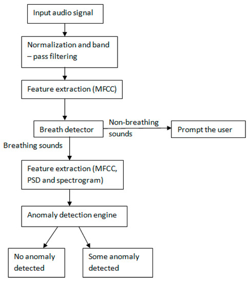 In humans, the respiratory system consists of the respiratory muscles, the lungs, and the airways. Breath sounds are the sounds produced by the structures of the lungs during breathing. The exchange of air between the atmosphere and the lungs (inspiration) and vice-versa (expiration) generates these breathing sounds. Breathing sounds are broadly classified as normal and abnormal breathing sounds. Normal breathing sounds can be loud, high pitched sounds heard over the trachea, medium pitched bronchovesicular sounds heard over the mainstream bronchi and soft, low pitched vesicular sounds heard over the chest. The most common types of abnormal breathing sounds are crackles, wheezes, rhonchi, and stridor [1]. Each of these abnormal breathing sounds can be a symptom of some serious respiratory diseases. Therefore, listening to breath sounds is an important part of early diagnosis. In this paper, we present an automated detection of anomalies in breath sounds using a smartphone [2,3] with nearly 95% accuracy against the user’s normal baseline and it offers a personalized report and trend of the results. In [1], measuring lung function is achieved by calculating the exhaled flow rate from the smartphone microphone. In [4], sequence classification models such as Hidden Markov Model (HMM) and Long Short-Term Memory (LSTM) variations are used to identify breath cycles followed by feedback. In [5], respiratory sounds are classified using adaptive neuro-fuzzy inference systems and artificial neural networks using the power spectrum density PSD as a feature. In [6], automation of lung analysis is carried out using time and frequency domain features such as variance, sum of moving average, spectrum mean, etc. In [7], the features of the Mel Frequency Cepstral Coefficients (MFCC) are analyzed using one-way ANOVA and are fed to some classification algorithms. In [8], spectral and wavelet features are used with various classification algorithms. In [9], Mel frequency analysis of breathing sounds is achieved with pattern recognition techniques to separate the breathing phases, to estimate the lung volume, and detect the presence of COVID-19.