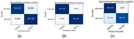 Normalized confusion matrix for (a) CNN model; (b) ensemble CNN model; and (c) Gated CRNN model (in percentage).