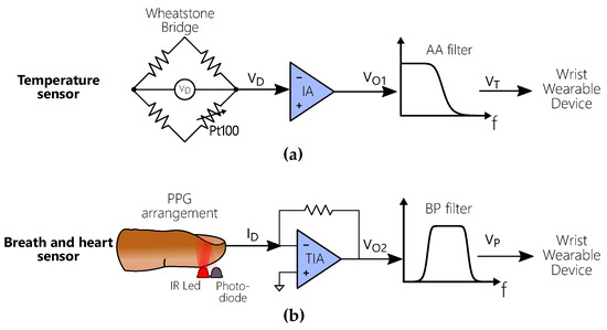 The BR and HR sensor uses the photoplethysmography technique. The PPG arrangement uses an infrared (IR) light-emitting diode (LED) at a centered emission wavelength of nm, whereas a photo-diode (PD) detects the reflected light on the skin. Wherein, the light intensity is the result of the interaction of cardiovascular, respiratory and autonomous nervous systems. As depicted in Figure 2b, the output current signal () is converted to a voltage signal () by a low-noise transimpedance amplifier (TIA). Finally, the output voltage is band-pass (BP) filtered to limit the bandwidth for the corresponding heart and breath rate frequencies.