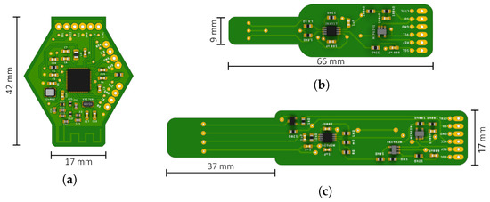 Wearable device circuit boards. (a) Wearable device core. (b) Temperature sensing module. (c) Breath and heart rate sensing module.