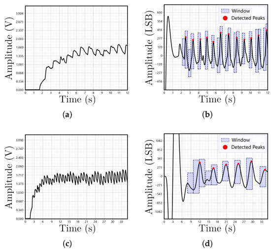 The breath and heart rates were extracted via the PPG signals. Figure 4a,c show the raw PPG signals for the HR and BR, respectively. Therein, one can see a high-frequency component and an envelope. The former is related to the cardiac cycle, whereas the latter is due to the respiratory rate. In Figure 4b,d we show the peaks detected by the PDA and the time window for digital filtering. As expected, the algorithm discards the initial time transients due to motion artifacts, and after a few seconds, starts to find local maxima, marked by red dotted peaks. Furthermore, one can see that the bandwidth is such that the filters operate with a fast response and without distorting the signals.