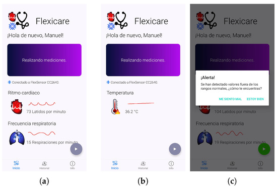 Mobile application main view. (a) HR and DR display. (b) Temperature display. (c) Alter system notification.