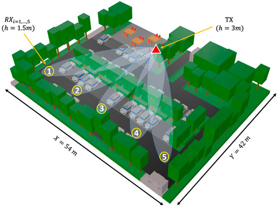- Sun, R.; Matolak, D.W.; Liu, P. Parking garage channel characteristics at 5 GHZ for V2V applications. In Proceedings of the IEEE Vehicular Technology Conference, Las Vegas, NV, USA, 2–5 September 2013; pp. 1–5. [Google Scholar] [CrossRef]