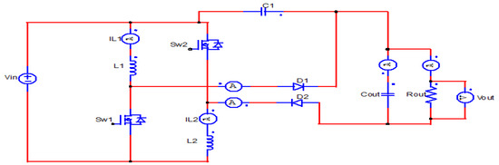The proposed topology is the “I-IIB Buck-boost/Boost reduced redundant power-processing converter” for PV applications, as shown in Figure 1. The design parameters of topology for PV application are given in Table 1. The proposed converter has a simpler design and the lowest number of switching components. The converter consists of the input voltage source, two inductors ( and ), two transistors (MOSFETs switch and ), two diodes, load, and two capacitors from which one is used as the storage element referred to the output capacitor, and other is used as a buffer capacitor to reduce the overvoltages and oscillations. The working principle of topology is that when both the switches are turned on, then both inductors named and start charging in parallel from dc source. The power demanded by load is supplied by the output capacitor.