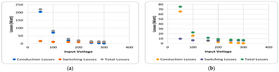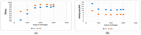 (a) Loss analysis of Si MOSFETs with change in input voltages; (b) loss analysis of SiC MOSFETs for input voltages.
