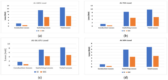 Figure 4a,b show switching and conduction loss for Si and SiC MOSFETS with different input voltages. The result show that as we increase the input voltage, the switching loss also increases. At low inputs, voltage conduction loss is high. The switching loss of SiC MOSFETs is much lower than Si MOSFET’s. Figure 5a–d show the loss comparison of switches at different power levels for full loads at 75%, 66.6%, and 50% load. SiC MOSFETs have substantially lower switching and conduction losses than Si MOSFETs.