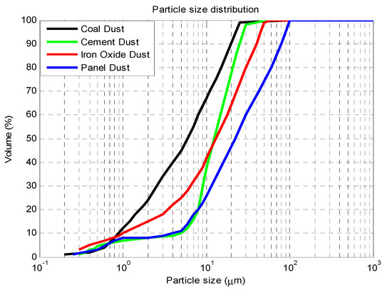 PSD of dust samples: coal dust (black), cement dust (green), iron oxide dust (red), panel dust (blue).