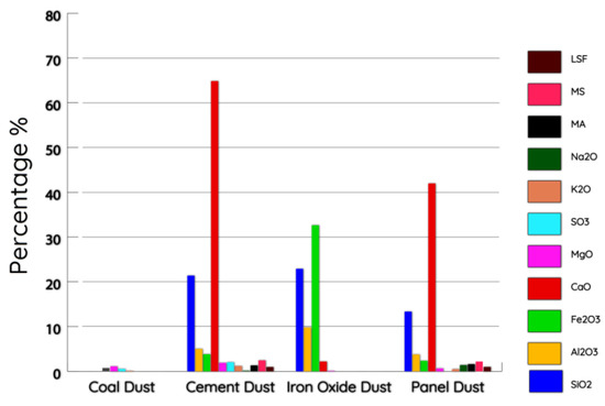 The dust samples were collected during the month of November 2021. The comparison of panel dust was carried out with coal, cement, and iron oxide dust collected from different areas of the cement plant. Cotton pieces were used for the collection of the dust. The following tests were performed for testing the attributes of the dust.