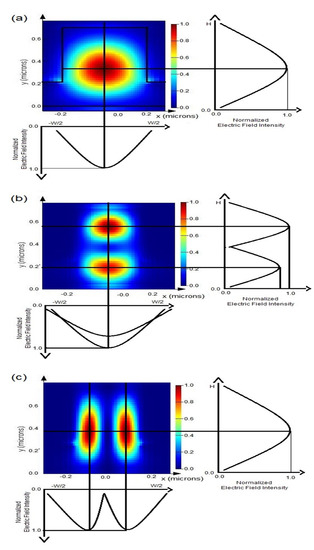 Mode field profile under the rib and its respective intensity variation with respect to the vertical (right hand side to the mode profile) and horizontal (below the mode profile) directions through the mode peaks: (a) fundamental mode (b) first-order vertical mode; (c) first-order horizontal mode. A single-mode waveguide would only support the fundamental mode profile. Reprinted by permission from American Scientific Publishers: J. Nanoelectron. Optoelectron. [5], Copyright 2017.