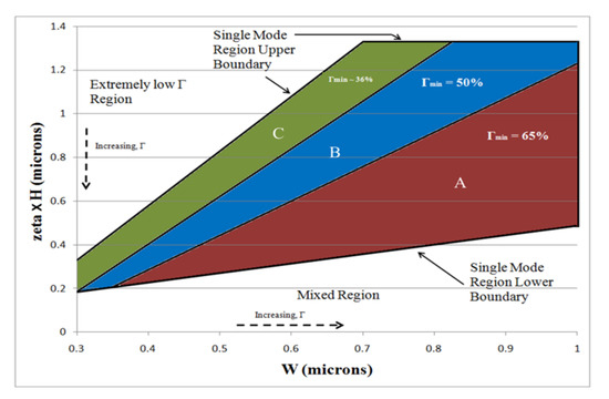 Plot of ζH vs. waveguide width where the shaded areas contain 100% single modes, with respective confinement factors. The broken arrows show the directions in which Γ increases. Reprinted by permission from American Scientific Publishers: J. Nanoelectron. Optoelectron. [5], Copyright 2017.