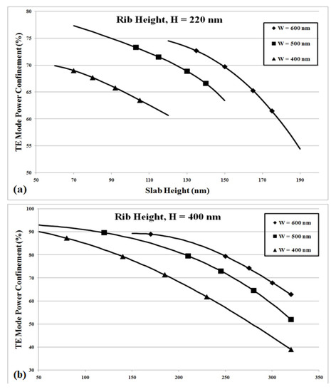 Any point in a particular region of Figure 3 represents a design which confines at least the percentage (given by Γmin) of the total power propagated in the mode volume. It is clear from the figure that as rib width increases and the slab height (h) decreases (manifests by the decreasing values of ζH product), the confinement factor would increase. This is true as an increasing etch depth (i.e., decreasing ‘h’) “squeezes” the lower portion of the fundamental mode into the rib region by providing an interface to reflect the lower edges of the rib. For this to happen, the rib width should be appropriately large; otherwise, the mode would start to leak out of the silicon region. For a fix slab height, the confinement factor also increases significantly with increasing widths and heights of the rib. Figure 4a shows the transverse electric (TE) mode confinement factor of the most commonly used rib height of 220 nm, while Figure 4b shows the same for 400 nm against the slab height. Here, the rib width is used as a parameter. It is evident from the figures that the slab height affects the mode confinement more drastically when the rib height is smaller; hence, the stringent process control is required for the fabrication of smaller devices. Secondly, the maximum amount of mode power confined by a particular structure is inversely proportional to the rib height. At the same time, to increase the device integration density and the operation speeds of active photonic devices, smaller dimensions are required [5]. Figure 4 shows that achieving this is possible if a waveguide is designed with the careful selection of the rib width and slab height.