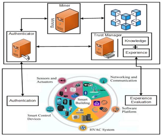 Our system is made up of many smart building floors, each of which contains a set of hardware facilities (such as computers, ordinary actuators, IoT nodes, and so on) as well as a verification manager in charge of making access control decisions, attempting to verify device characteristics, and producing access control tokens. Moreover, each device on the smart building floor is connected to a trust manager responsible for determining the level of trustworthiness and assessing and calculating a comprehensive trust value for each associated device. This entity is expected to be located in a more powerful network node linked directly to every node in the scenario of IoT nodes with stringent resource limits; otherwise, it is implemented within the device itself. Following that, a collection of particular devices (miners) is implemented to receive trust values, create components, and transmit them into the blockchain system. More information is available in the section below.