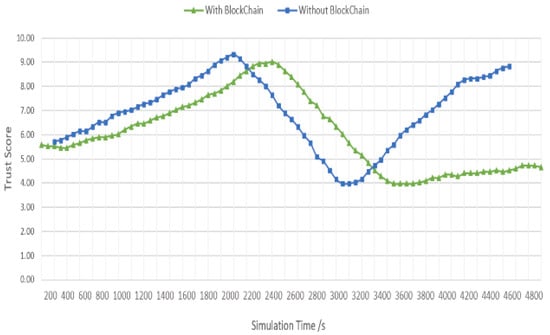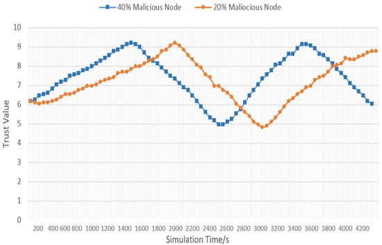We examined the evolution of a malicious node’s trust value in Figure 2 as the fraction of total bad nodes executing ballot stuffing and on–off attacks increases. The malicious node alternated between behaving well and badly in packet delivery behavior in an on–off attack. Figure 3 represents that once a problematic node’s trust value goes below 0.4 and repeatedly acts correctly, it is punished. Its score is kept at 0.4 thanks to a function provided by blockchain technology.