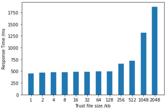 The reaction time was assessed while altering the size of the file containing trust information and trust ratings for every evaluated object in the network. The files came in different sizes, from one kilobyte to two megabytes. The average response of the blockchain system increase in lockstep with the size of the trust file, as seen in Figure 4.