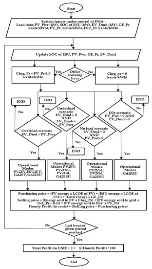 In the proposed EMA, the operation of the PV–grid system is divided into four main scenarios. These four scenarios work according to previously described operating modes which are controlled by the central EMA, categorized as the overload scenario, underload scenario, no-load scenario, and idle condition. The EMA-based operation of the charging system is shown in Figure 2. The objective is to charge the EV without interference at a specified constant price. This charging price (Chrg_Pr) was taken to be USD 0.01 lower than PV_Pr (Chrg_Pr = PV_Pr − USD 0.01/kWh) to hold it below the Avg_GE_Pr under the conditions of par as well as the below parity. The charging price can also be set to any other value. The GE_Pr is directly proportional to grid overloading; therefore, the off-peak conditions (in this study) were based on GE_Pr. Thus, off-peak conditions commenced when GE_Pr < Avg_GE_Pr. The off-peak conditions can also be written as GE_Pr ≤ ESU_Pr, because the assumed value of ESU_Pr is already less than Avg_GE_Pr = PV_Pr. Notably, the EMA was designed to operate on the basis of no profit, no loss. The “no profit” aim facilitates the EV clients with the minimal conceivable charging price, whereas the “no loss” condition protects the charging stations from financial losses.