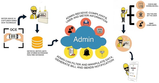 The system comprises a meter reader who reads the meter through a mobile application and a consumer who checks the consumption units at home through a mobile app. This helps in monitoring the usage of gas in a month. A mobile application is designed to support both meter reader and user. The application works by utilizing OCR technology. The admin panel is a website that has complete access to a large database, which is responsible for data manipulation, bill generation, and report maintenance, as well as many other tasks as shown in Figure 1.