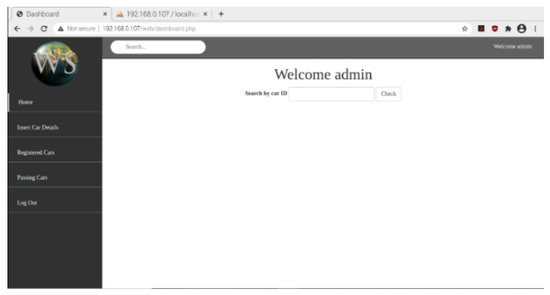 In Figure 3, after login the dashboard screen appears where the check car id is registered and not registered from the database. Home, Insert Car Details, Registered Cars, and Passing Cars are subcategories in the left panel.