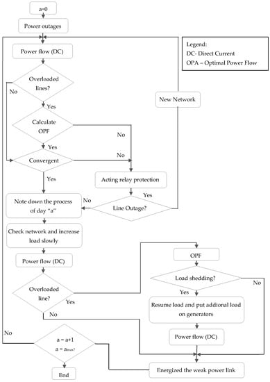 - If a = amax then stop the program and go back to step number 2. The equation a = a + 1 is used for the slow dynamics. A flow chart of the proposed blackout model is shown in Figure 1.