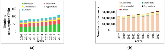 Past consumption of electricity and number of consumers are presented in Figure 1a,b [14].