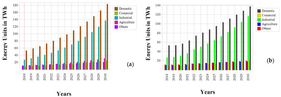The sector-wise demand for energy in Pakistan is forecasted till 2030 under the BAU and EC scenarios. The energy demand under the BAU scenario for the years 2018, 2022, 2026, and 2030 is 110.9 TWh, 168.5 TWh, 258.3 TWh, and 399.0 TWh, respectively. The energy demand under the EC scenario for the years 2018, 2022, 2026, and 2030 is 110.9 TWh, 157.5 TWh, 224.5 TWh, and 312.6 TWh, respectively. The demand for energy for the years 2018–2030 is depicted in Figure 2. The domestic sector will be the highest electricity-consuming sector as compared with the others, such as the agriculture, industrial, and commercial sectors.