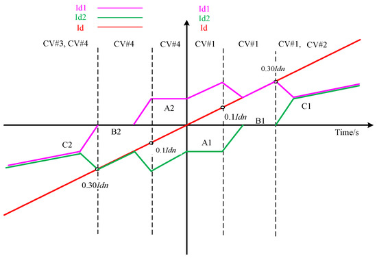 In the region, the converters CV1 and CV4 operated in circulating mode (−10% Idn ≤ Id ≤ 10% Idn). The single bridge operation of the converters CV1 and CV2 is shown in regions (10 %Idn < Id ≤ 30 %Idn) and (−30% Idn ≤ Id < −10 % Idn). Converters CV1, CV2, CV3, and CV4 all performed well in areas Id > 30% Idn and Id < −30% Idn, respectively.