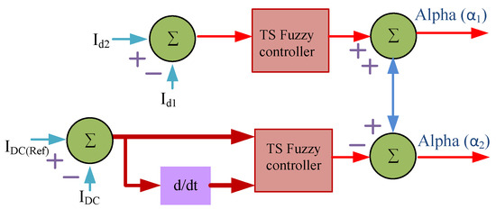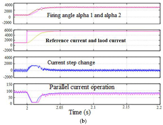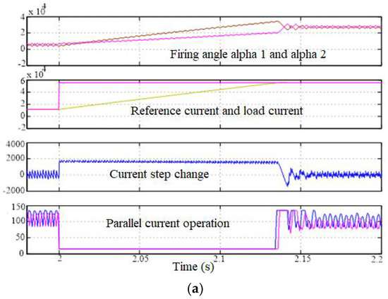 The load’s varied firing sequences are angles alpha 1 and alpha 2 in Figure 5, and the system’s response was exhibited. Both the TS fuzzy controller and the PI controller had excellent performance. The simulation research confirmed that the TS controller had better responsiveness than the PI controller. The load step change at 2 s had great impact on the current change. Plasma sustainability was the key feature. The DC power converter was very sensitive to load changes. Figure 5b shows that the TS controller was stable and had a good response compared to the PI controller.