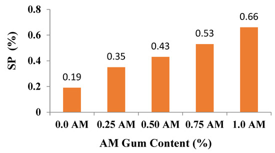 The result of the superplasticizer (SP) demand of various SCP formulations containing AM gum powder is shown in Figure 1. From these results, it can be concluded that super-plasticizer demands of the SCPs containing AM gum powder increases with the increase in content of the AM gum due to increased internal friction, irregular and rough external surface. Secondly, it might be increased due to the anionic polysaccharides present in acacia gums [22]. The calcium ions (Ca2+) present in the cement paste or H+ ions present in mixing water may get adsorbed on the polysaccharides through ionic attraction, causing an increased attraction between the cement grains and AM gum powder resulting in an enhanced viscosity. It is an indication that AM gum powder can be used as viscosity-modifying agent in SCPs.