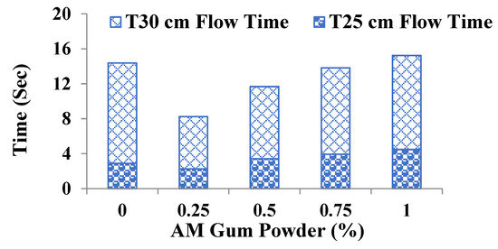 T25 cm flow time, in a Hagerman’s mini-cone flow test, is a measure of viscosity of the system while T30 cm flow time is a function of yield stress of SCP systems. Figure 2 depicts the T25 cm and T30 cm flow times of SCPs containing different dosages of AM gum powder. With the increase in AM gum content, the time required (T25 and T30) to reach the specific flow value (30 ± 1 cm) increased, indicating that the qualitative plastic viscosity and qualitative yield stress of the respective SCP system becomes higher with the incorporation of AM gum in SCP systems. This further strengthens the postulate that acacia gum acts as a viscosity-enhancing agent.
