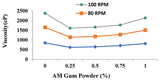 Apparent viscosity of the SCPs is measured using a rheometer to carry out the rheometric investigations. Viscosities are measured for 2 min at shear rates of 20.4 s−1, 27.2 s−1, and 34 s−1 corresponding to 60 rpm, 80 rpm, and 100 rpm, respectively. The shear rates selected are the same through which concrete passes during the processes of mixing, placing, and casting [23]. From Figure 3, it can be seen that the apparent viscosity of the SCP systems increases with the increase in AM gum content. This could be due to adsorption, association or intertwining [15,24,25]. This property is known as shear thinning and is more prominent for formulations containing higher dosages of AM gum powder. Moreover, the results obtained through rheometric investigation compliment the viscosity and yield stress results obtained indirectly through the mini-cone slump flow test by measuring T25 cm and T30 cm times.