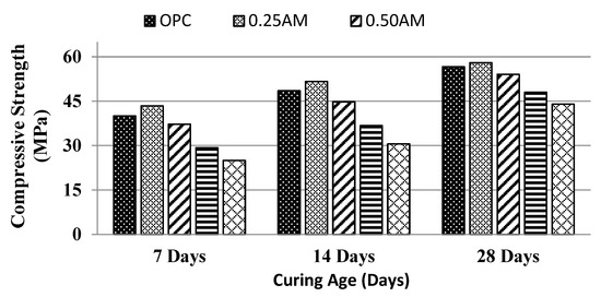 The results of the compressive strength test conducted using a universal testing machine are shown in Figure 4. From the results, it can be inferred that the compressive strength decreases as the AM gum content increases which is in accordance with the literature reporting that AM gum reduces the strength of SCPs [3,4,5,27]. This reduction can be associated with the air content which increases with the increase in AM gum dosage, resulting in weaker SCP matrix by enhancing the porosity of the system. It can also be inferred that as the fresh and hardened densities decrease, the corresponding compressive strength values also decrease and the maximum strength is attained when the fresh and harden densities are maximum. Moreover, compressive strength with 0.25% AM gum content at the age of 28 days exceeds by about 2.5% as compared to OPC. So, the strength degradation caused due to addition of AM gum powder can be mitigated using a smaller average particle size of AM gum powder.