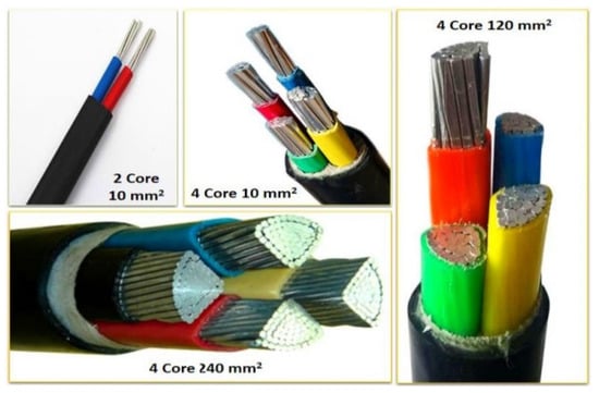 A common cable size used in the domestic distribution systems is 10 mm2 (2-core, 4-core). These cables have different protection layers for the conductor, including PVC (for sheath and armoring). Although this type of cable has higher durability, shielding, elastic modulus, and optimum electrical conductivity. Also its infrastructure cost will be higher compared to an overhead structure and its maintenance and operation expenditures are not cost-effective []. In household networks, single-phase or three-phase connections are used. The increasing population has a crucial effect on the load profile of the system [].