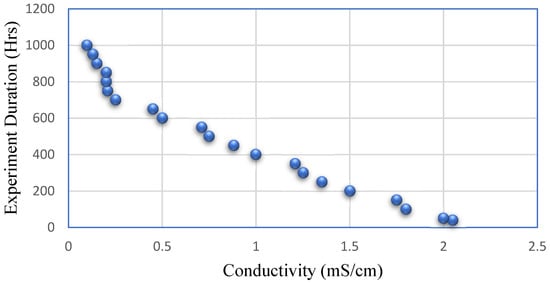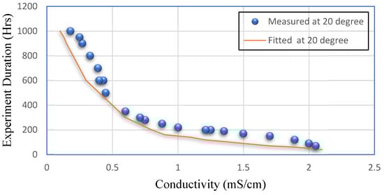 A visual inspection of the samples throughout the experiment at high conductivity value found that the corrosion byproduct was formed and rapidly separated from the surface of the conductor. This effect may describe the experiment’s exceedingly long period at 20 °C and conductivity at 0.35 mS/cm. The electrolytic solution’s conductivity was minimally altered by the operation. According to Equation (1), a linear relation may be inserted in the above plot at an applied temperature value in Figure 5.