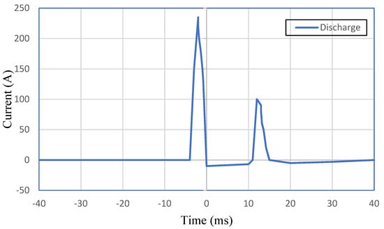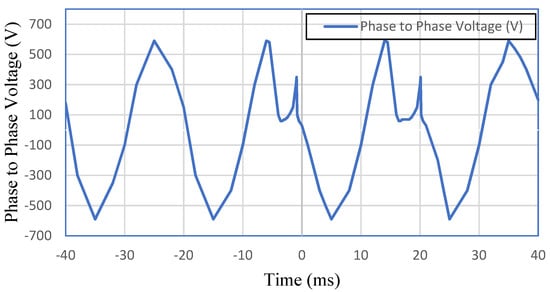 Whenever a malfunction in the secondary distribution system triggers the breaker, the outage is defined as an intermittent fault, although the circuit appears to work properly after the breaker is replaced. Unfortunately, the issue will usually resurface after a certain time, ranging from a few minutes to several weeks, or even more. Such intermittent failures are believed to be the result of earlier damage caused by the wire conductor and insulations interacting with the moist atmosphere. Dry-band arcing is caused by an electrolyte that partially evaporates, producing a narrow spectrum with a strong electric field intensity. Arcing generates black spots on the insulating material and in between the conductors, causing it to melt and polluting the area with conductive powder. A breakdown happens when enough impurity has accumulated on the insulator’s top. The currents participating in the dry-band arcing mechanism are likely to be difficult to differentiate from the load currents, particularly in the case of LV cables. The breakdown of conductor results in hundreds of amperes or more, which may be clearly monitored in the secondary distribution system. Current peaks and voltage waveform in such breakdowns were observed and are shown in Figure 6 and Figure 7.