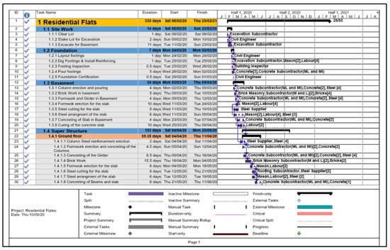 We have selected a residential (three-story) building with a 5600 square feet cover area for our case study; the details are in Table 1. Activities are computed in MS project and connected by various dependencies, e.g., finish–start, start–start, start–finish, and finish–finish.