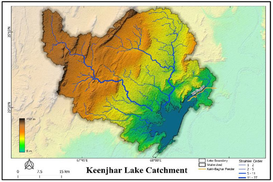 Water quality is a relatively new study area in Pakistan as the country lacks basic education and a proper monitoring system. Freshwater lakes are a major source of drinking water; therefore, a quality monitoring system is essential to ensure health standards. Sediment is one of the major sources of pollutants as it carries various polluting elements as well as metals, nitrate, orthophosphate, and carbon and deteriorates the quality of the water body [1]. Major sources of sediment include non-point runoff and the water supply by an unlined canal. The purpose of this study is to use remote sensing techniques to determine suspended sediment concentrations in Keenjhar Lake for water quality monitoring and evaluation. Keenjhar Lake is the largest artificial lake in Pakistan and the major source of water supply to the cities of Karachi and Thatta. It is situated from 67.70° E to 68.00° E and 24.75° N to 25.25° N, with a capacity of roughly 0.5 MAF and a depth of 1 m to 9 m. It has the main recharge source of KB Feeder, and some streams discharge runoff in the monsoon season. The lake is a major source of supply of drinking water in the neighboring cities and towns, and a large number of people visit regularly from Karachi, Hyderabad, and Thatta to enjoy picnics, swimming, fishing, boating, and other recreational activities. When rainwater reaches the lake via the Haroolo drain, it contaminates the water, making it doubtful to drink when mixed with the lake water (SUPARCO). Furthermore, the sediment yield from the unlined Karli Baghar (KB) Canal contributes to degradation of water quality and reduction in the lake’s storage capacity. Figure 1 shows the catchment and drainage pattern of Keenjhar lake while range of quality is shown in Table 1.