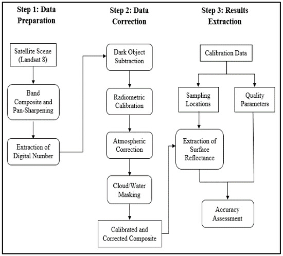 The process includes the acquisition and pre-processing of images, radiometric and atmospheric correction, calculation of surface reflectance values, and transformation of the spectral signatures into water quality parameters. The processing methodology derived from the literature review is comprised of three stages, given below, and shown in Figure 2.