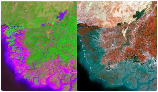 Band combinations used for the study. (4-5-3 and 5-3-2 for RGB from left to right).