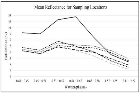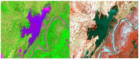 Pixels of the x–y position of the in-situ sample point were chosen to analyze the reflectance data. The pixel window size was chosen based on the idea that the quality characteristics of water are heterogeneous and fluctuate regularly due to seasonal, solar, and meteorological effects; therefore, a larger window will capture some of that fluctuation [5]. The images in the Figure 3 express different band compositions, calibrated and processed before being used to determine reflectance in six different locations. The subset images focusing the study area of the lake shown in Figure 4. In this case, selection of date and time as well pixel locations were dictated by official and confidential water quality sample tested data (which cannot be shown here) in the same location.